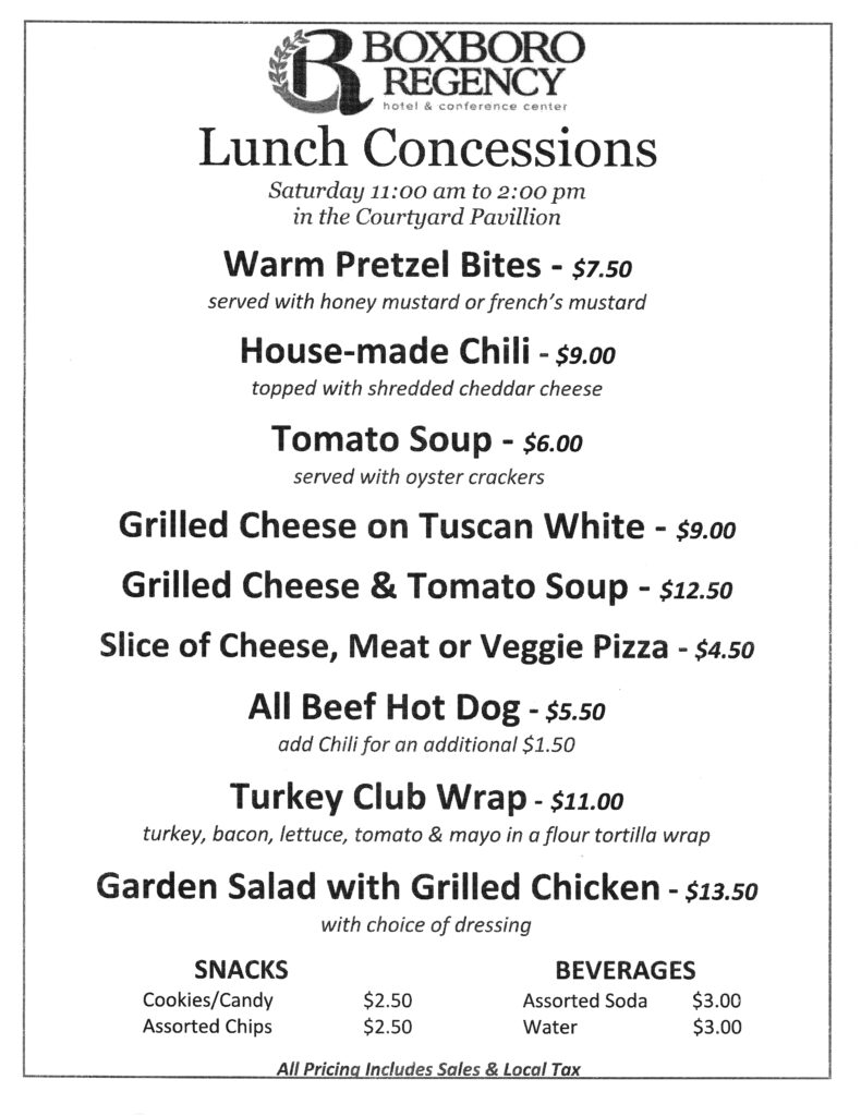 For Saturday the Concession stand will be Sat 11 – 2 pm in the Courtyard Pavillion.
